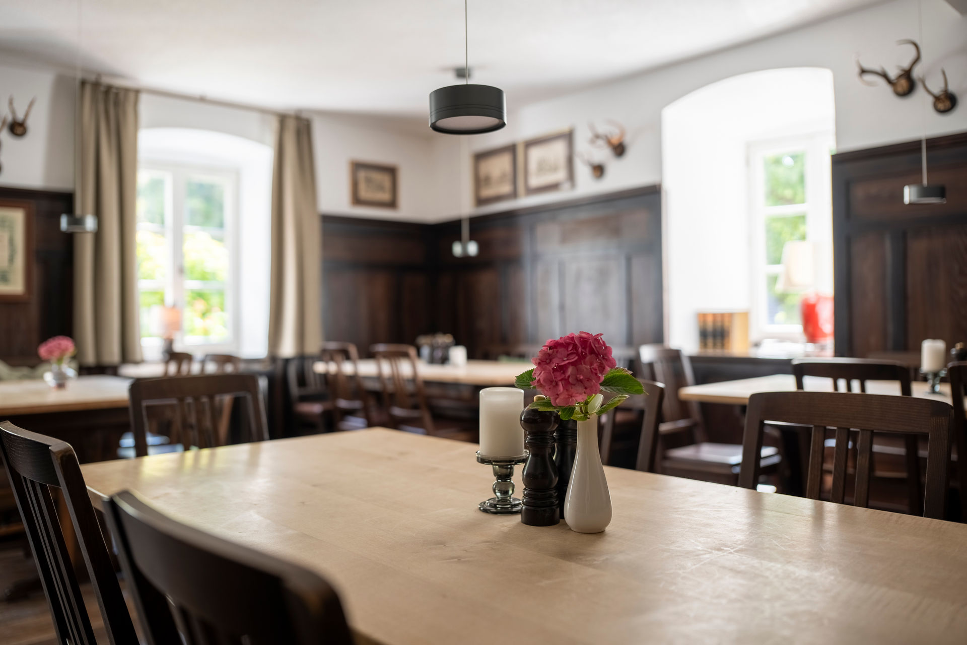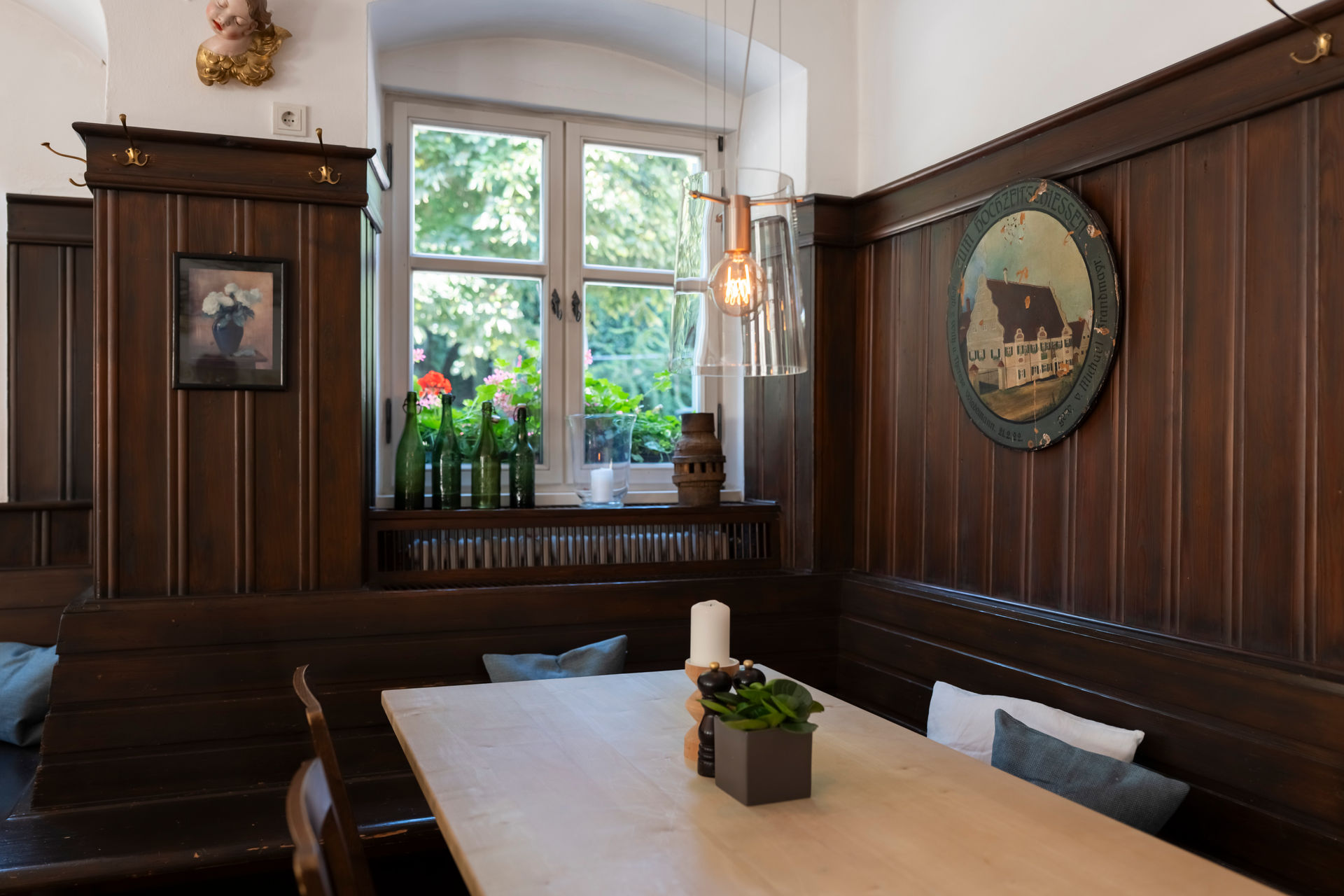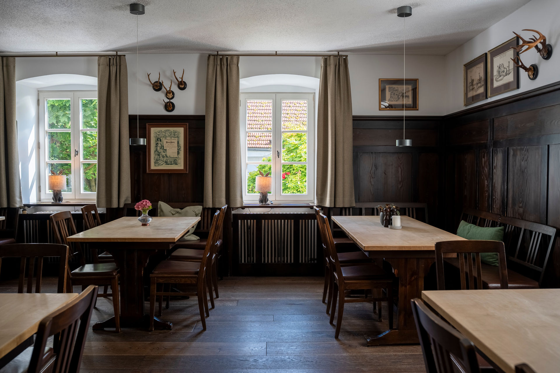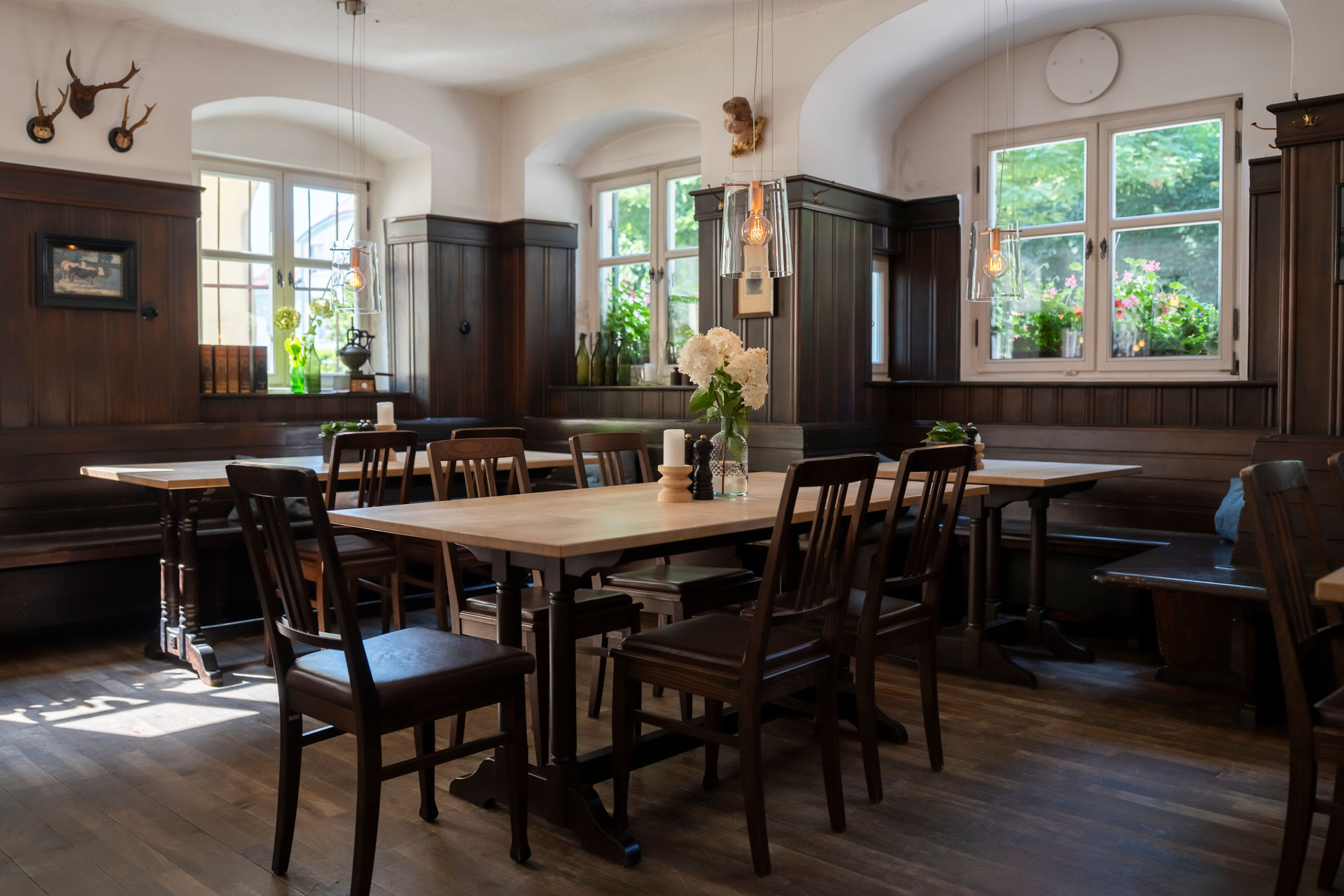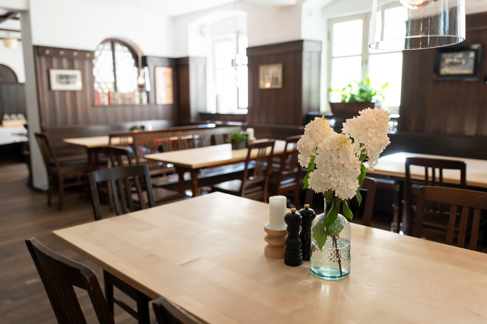 In der nach ihm benannten Ludwig-Thoma Stube mit den hellen Ahorntischen und der edlen Holzvertäfelung speist es sich heute noch genauso urig wie damals. In unserer Wirtsstube bilden rustikale Holztische und moderne Akzente eine stilvolle und behagliche Atmosphäre. Bei schönem Wetter lädt unser romantischer Biergarten im idyllischen Innenhof zum Verweilen und Entspannen ein.